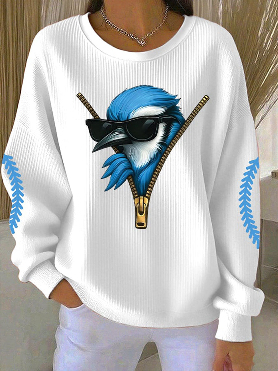 Women's Baseball Blue Bird Ribbed Round-Neck Sweatshirt