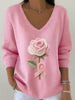 Women's Pink Rose Beaded Embroidered V-Neck Ribbed Top