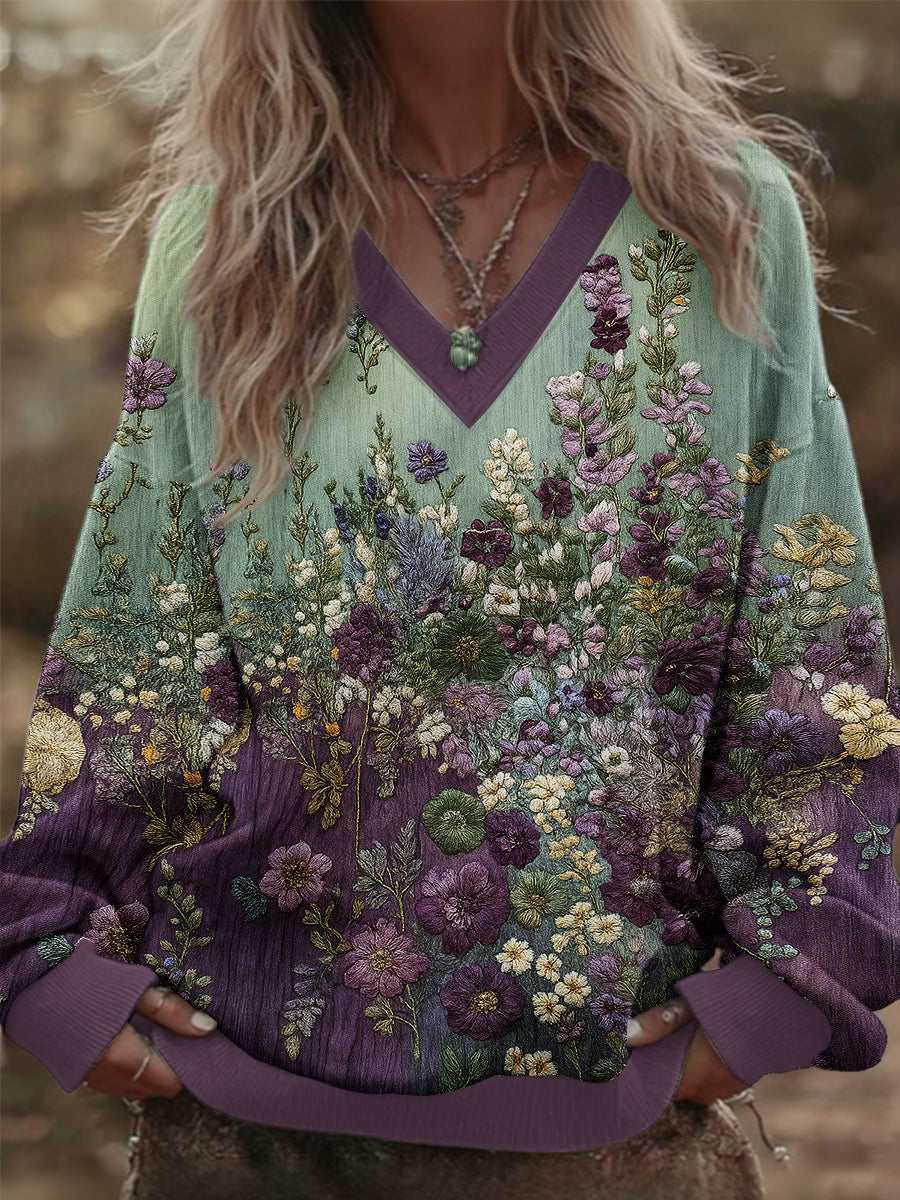 Women's Gradient 3D Floral V-Neck Sweatshirt