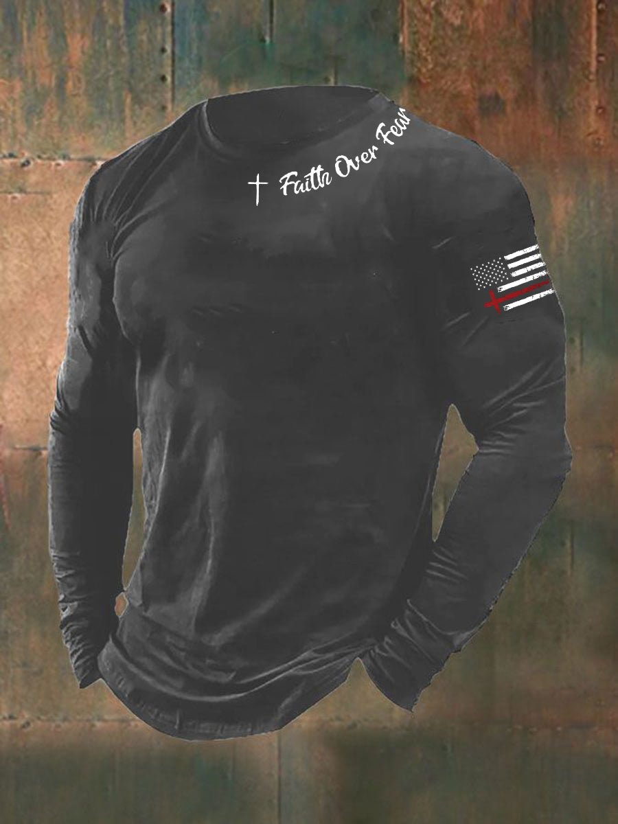 Men's Faih Over Fear Flag Cross Print Long Sleeve T-shirt