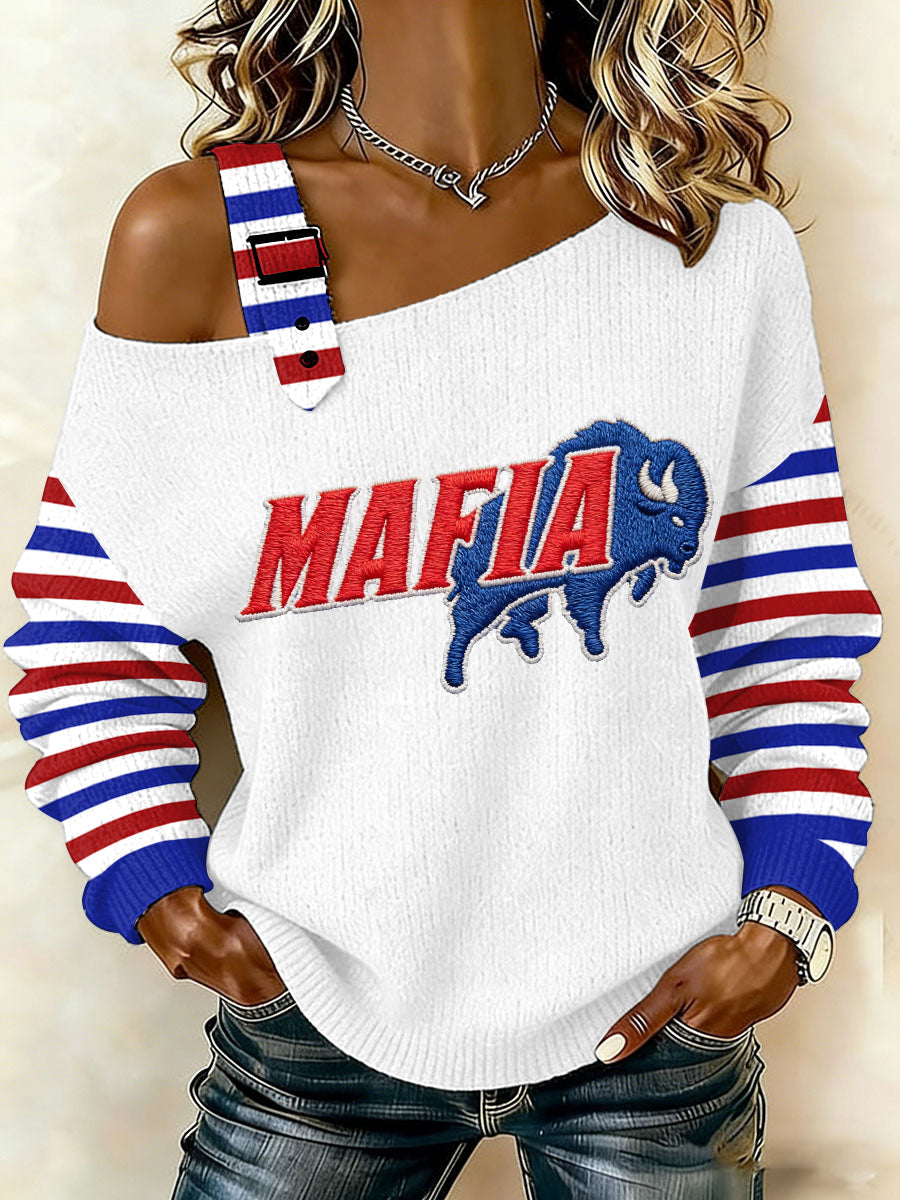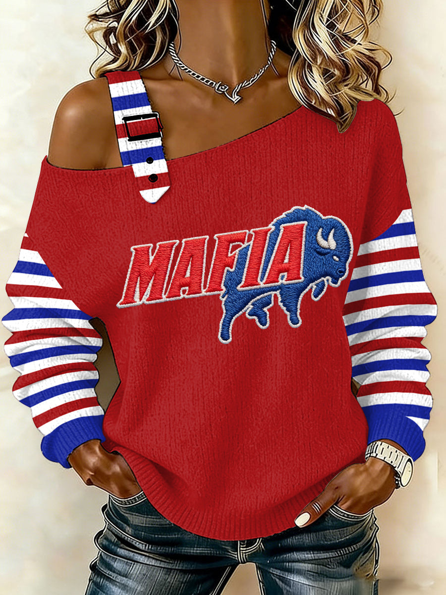 Women's Bills Mafia Stripes Print Football Fans Gameday Casual Off-Shoulder Top