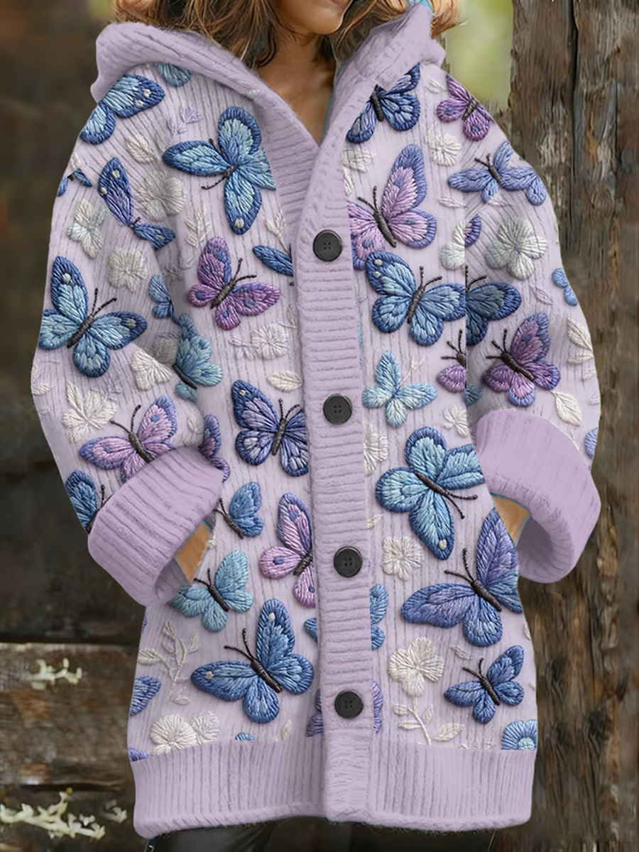 Women's Casual Purple Butterfly Print Composite Fleece Long Coat