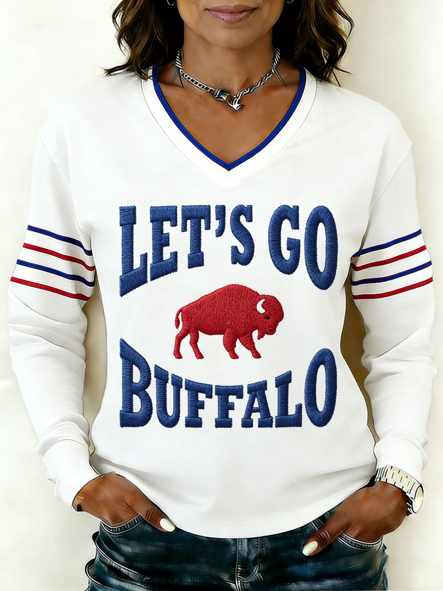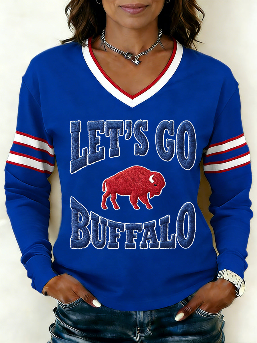 Women's Let's Go Buffalo Football Fans Gameday Casual V-Neck Long Sleeve T-Shirt