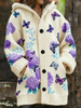 Women's Vintage Purple Floral Art Print Composite Fleece Long Coat